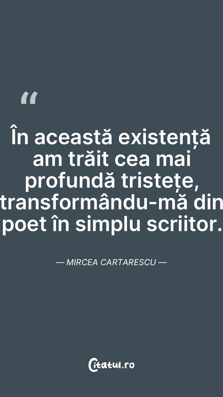 În această existență am trăit cea mai profundă tristețe, transformându-mă din poet în simplu scriitor. Mircea Cartarescu