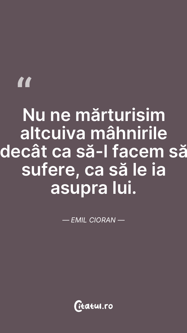 Nu ne mărturisim altcuiva mâhnirile decât ca să-l facem să sufere, ca să le ia asupra lui. Emil Cioran