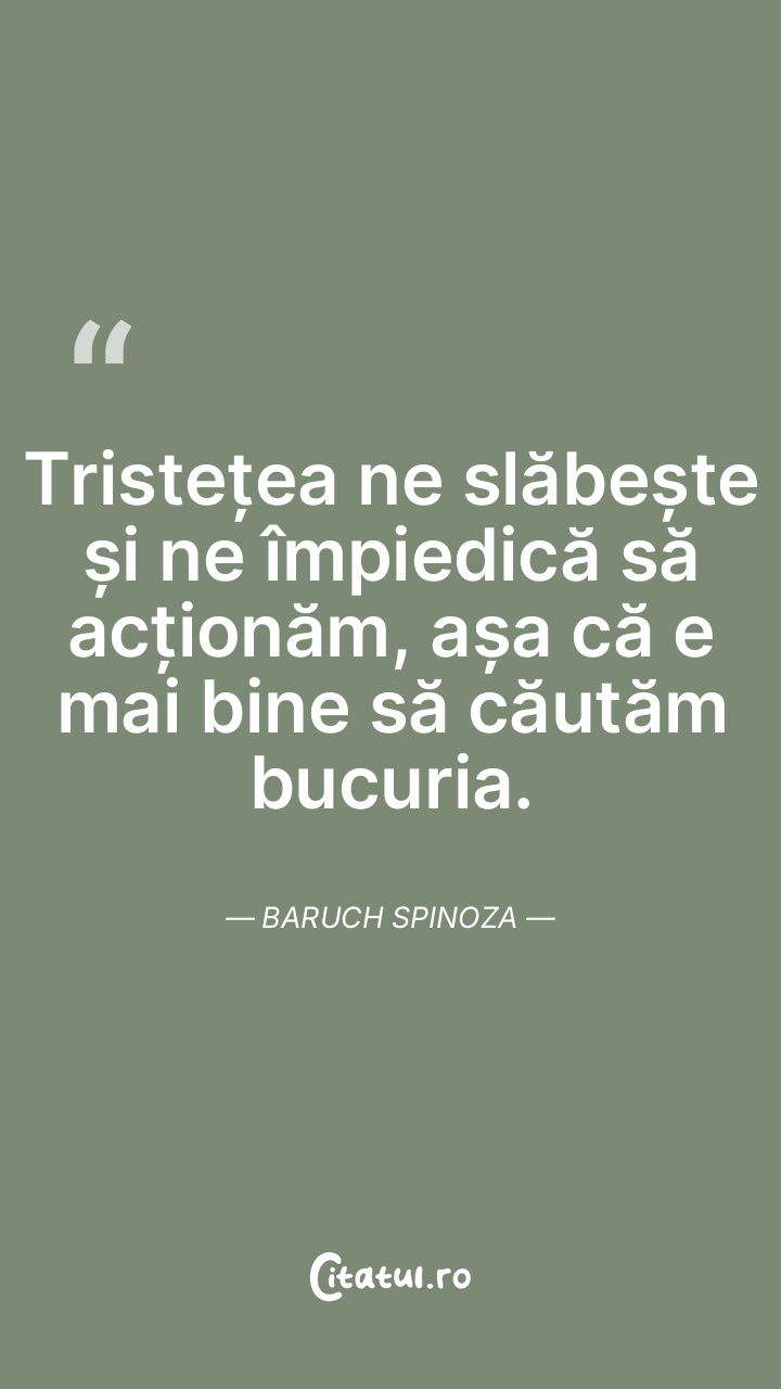 Tristețea ne slăbește și ne împiedică să acționăm, așa că e mai bine să căutăm bucuria. Baruch Spinoza