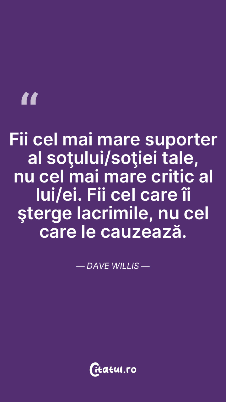 Fii cel mai mare suporter al soţului/soţiei tale, nu cel mai mare critic al lui/ei. Fii cel care îi şterge lacrimile, nu cel care le cauzează. Dave Willis