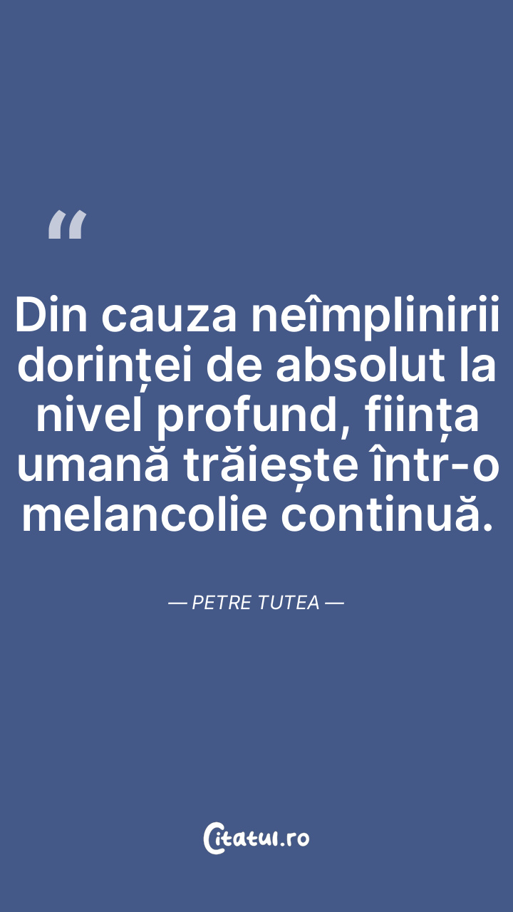 Din cauza neîmplinirii dorinței de absolut la nivel profund, ființa umană trăiește într-o melancolie continuă. Petre Tutea