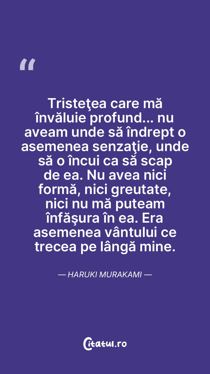 Tristeţea care mă învăluie profund... nu aveam unde să îndrept o asemenea senzaţie, unde să o încui ca să scap de ea. Nu avea nici formă, nici greutate, nici nu mă puteam înfăşura în ea. Era asemenea vântului ce trecea pe lângă mine. Haruki Murakami