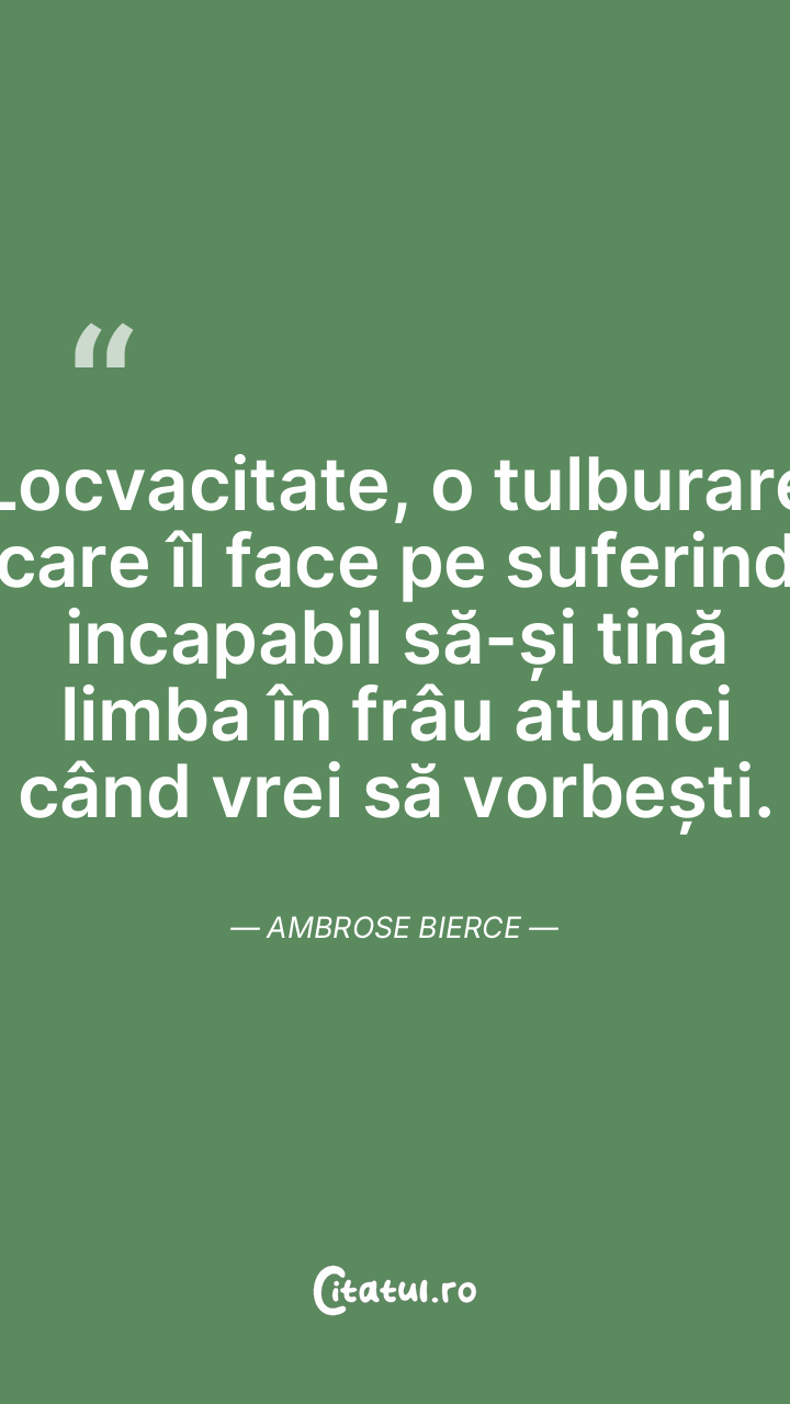 Locvacitate, o tulburare care îl face pe suferind incapabil să-și tină limba în frâu atunci când vrei să vorbești. Ambrose Bierce