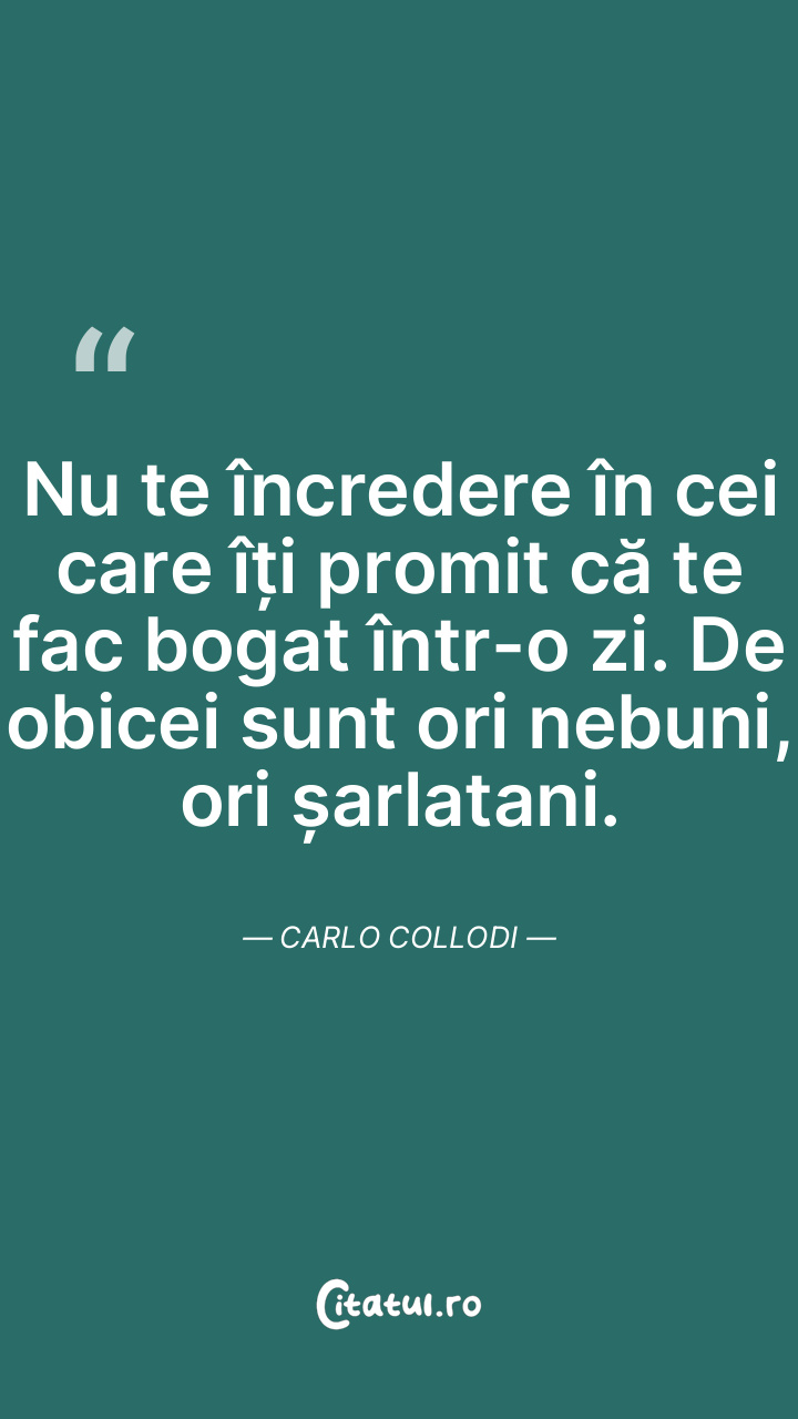 Nu te încredere în cei care îți promit că te fac bogat într-o zi. De obicei sunt ori nebuni, ori șarlatani. Carlo Collodi