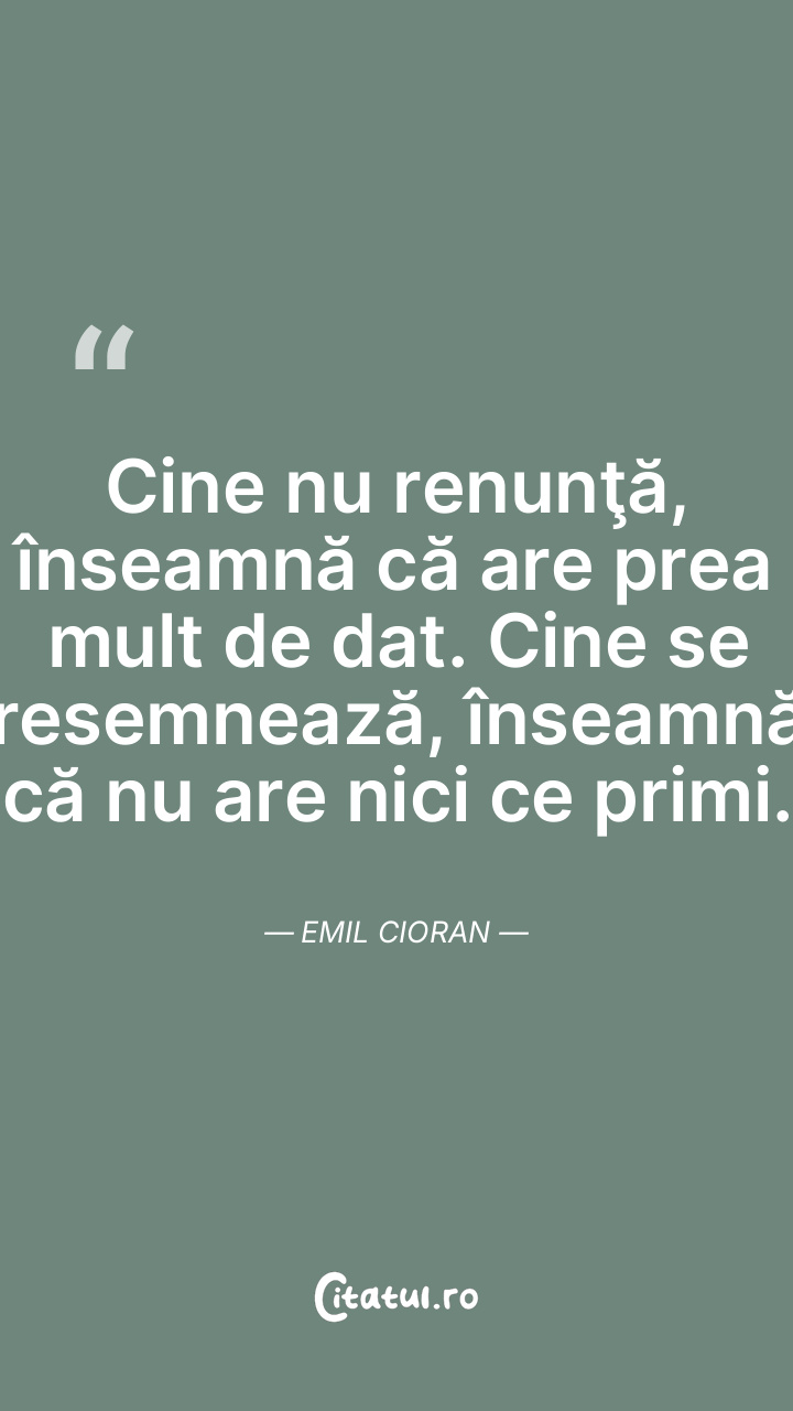 Cine nu renunţă, înseamnă că are prea mult de dat. Cine se resemnează, înseamnă că nu are nici ce primi. Emil Cioran