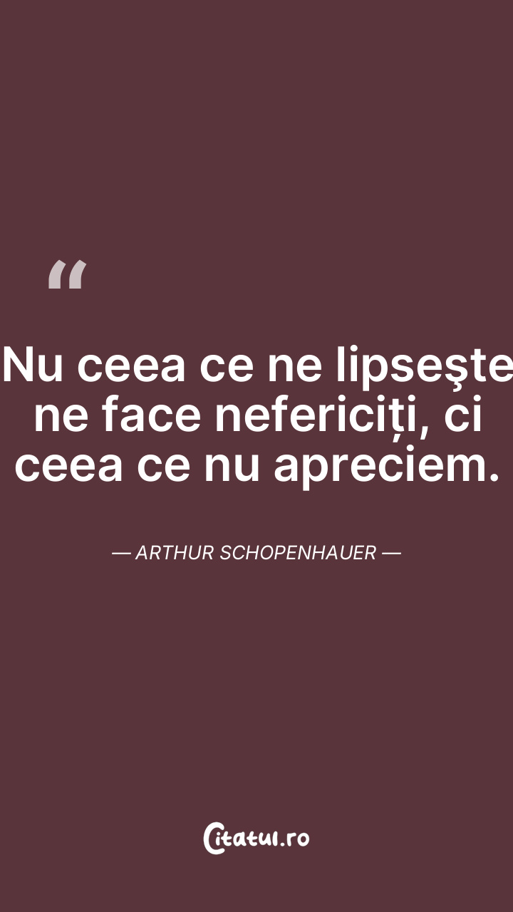 Nu ceea ce ne lipseşte ne face nefericiți, ci ceea ce nu apreciem. Arthur Schopenhauer