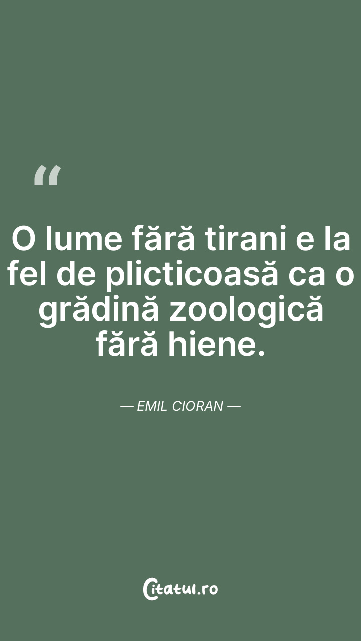 Lumea nu trăieşte în mediocritate, ci într-o nefastă lipsă de măsură. Iată de ce nimic şi nimeni pe lume nu se află la locul său, în vreme ce dacă lumea ar fi mediocră, ar exista o potrivire oarecare în situaţii şi în destine. Emil Cioran