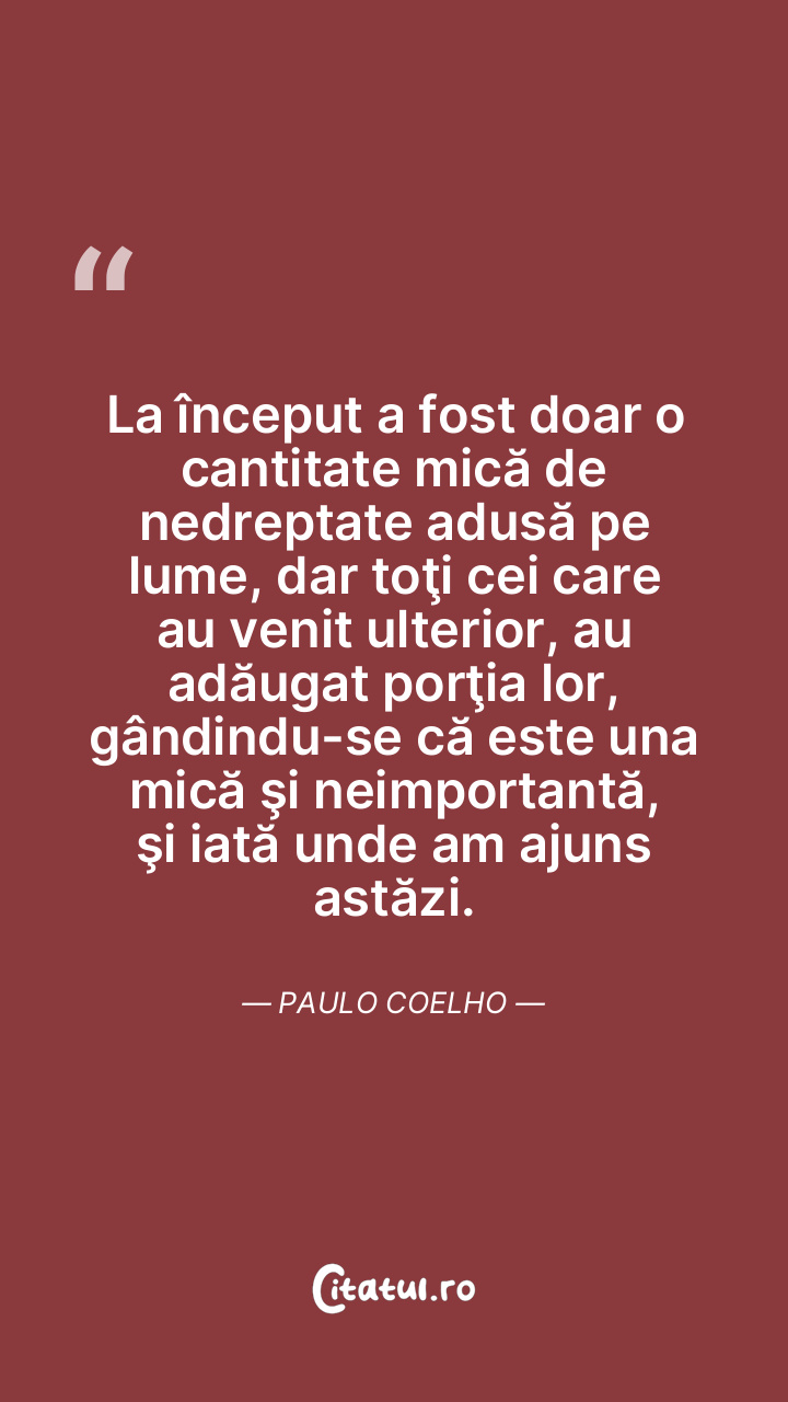 Indiferent ce face, fiecare persoană de pe pământ joacă un rol central în istoria lumii. Şi, de obicei, nu ştie asta. Paulo Coelho