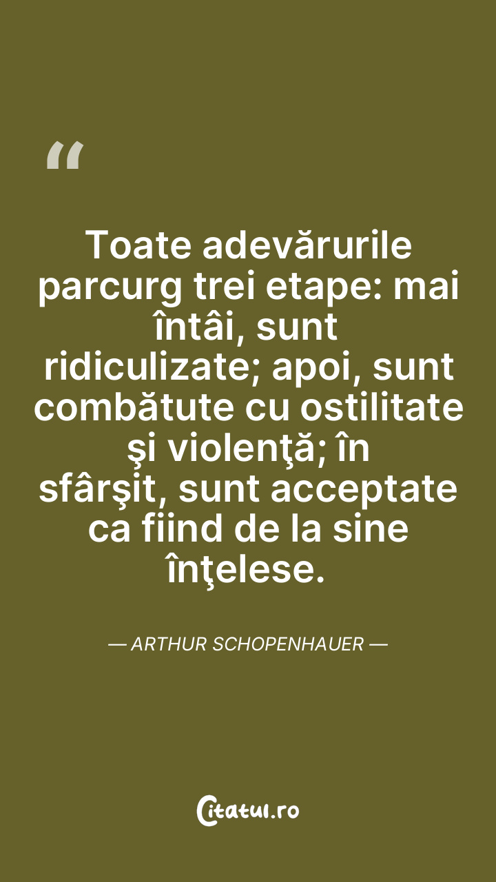 Orice adevăr trece prin trei etape. Prima dată, e ridiculizat. A doua oară, negat vehement. A treia oară, e acceptat ca fiind de la sine evident. Arthur Schopenhauer