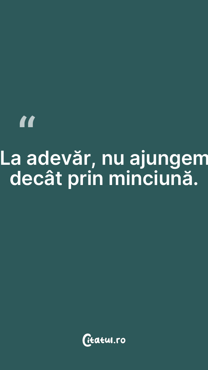 Adevărul e următorul: totul e o minciună. ... Categorie: citate viata Dificultate: Ușor de citit și înțeles Votează: ★ ★ ★ ★ ★ (0/5 din 0) Distribuiți acest citat? Alegeți platforma preferată: Salvează citatul in telefon/pc Adevărul e următorul: totul e o minciună. Copiază Favorite Eroare