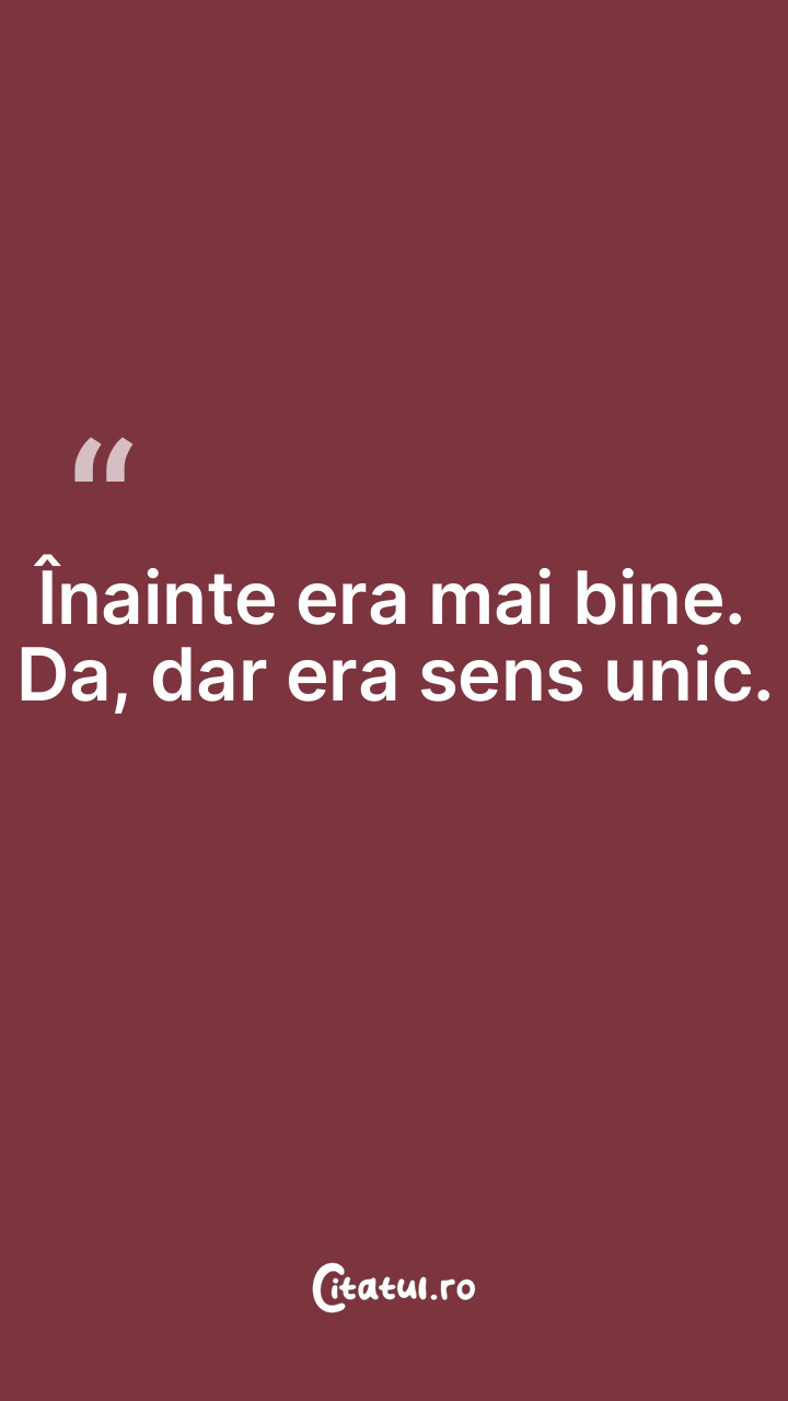 Înainte nu era mai bine; acum e mai rău. ... Categorie: citate viata Dificultate: Ușor de citit și înțeles Votează: ★ ★ ★ ★ ★ (0/5 din 0) Distribuiți acest citat? Alegeți platforma preferată: Salvează citatul in telefon/pc Înainte nu era mai bine; acum e mai rău. Copiază Favorite Eroare