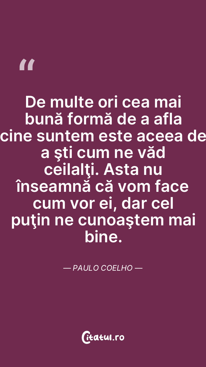 Şi de multe ori cea mai bună formă de a afla cine suntem este aceea de a şti cum ne văd ceilalţi. Asta nu înseamnă că vom face cum vor ei; dar cel puţin ne cunoaştem mai bine. Paulo Coelho