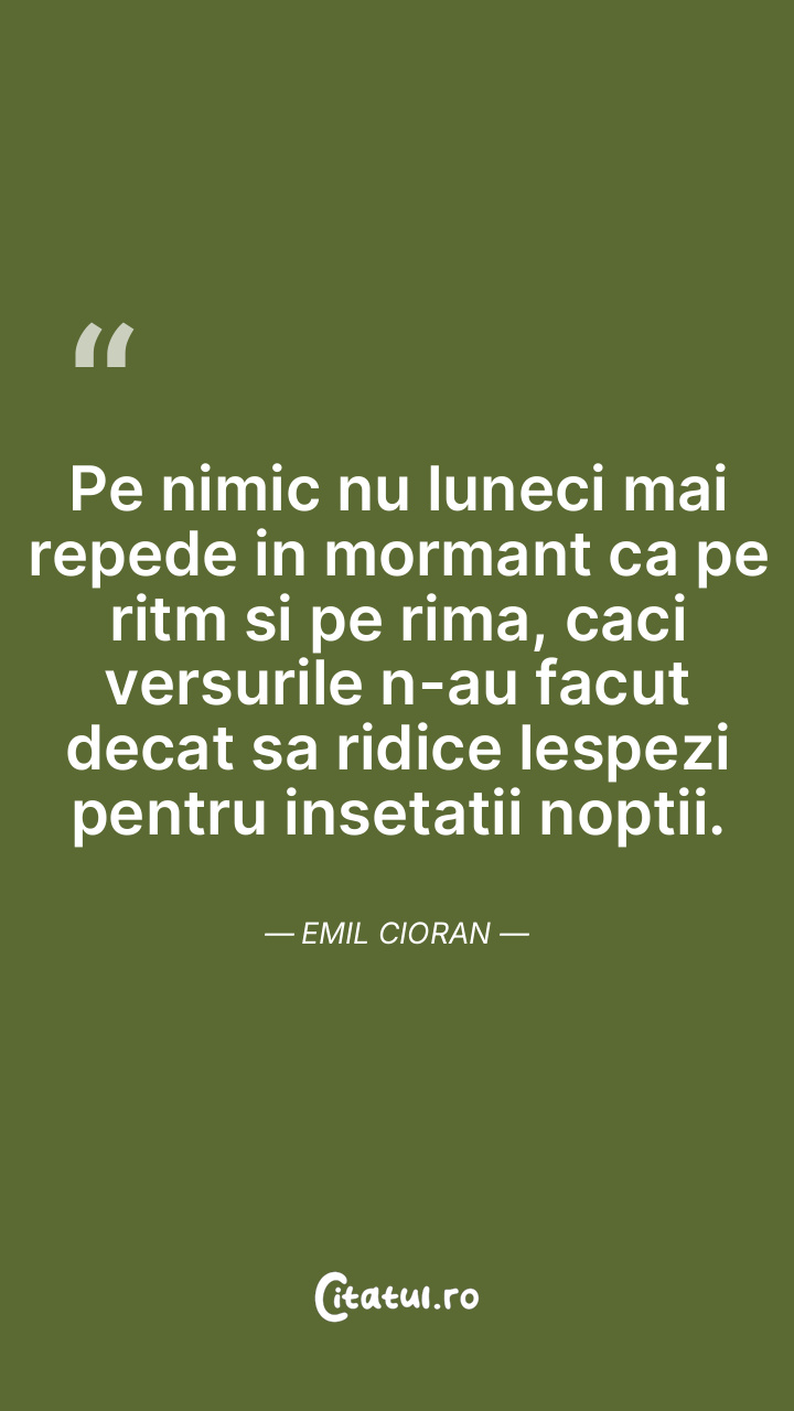 Singurele momente la care ma gandesc consolat sunt cele in care am dorit sa nu insemn nimic pentru nimeni, in care am rosit la gandul de a lasa cea mai mica urma in memoria oricui ar fi. Emil Cioran