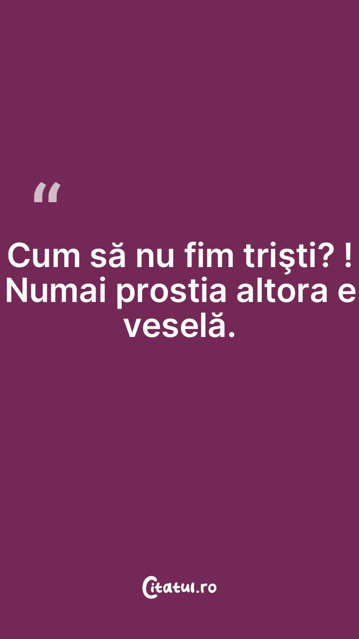 Numai nebunii se înconjoară de proşti. ... Categorie: citate viata Dificultate: Foarte ușor de citit! Votează: ★ ★ ★ ★ ★ (0/5 din 0) Distribuiți acest citat? Alegeți platforma preferată: Salvează citatul in telefon/pc Numai nebunii se înconjoară de proşti. Copiază Favorite Eroare