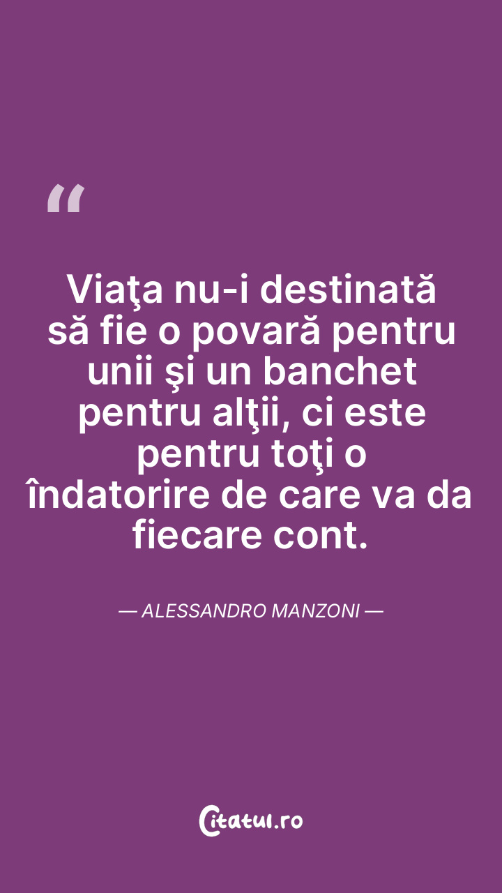 Viaţa nu-i destinată să fie o povară pentru unii şi un banchet pentru alţii, ci este pentru toţi o îndatorire de care va da fiecare cont. Alessandro Manzoni