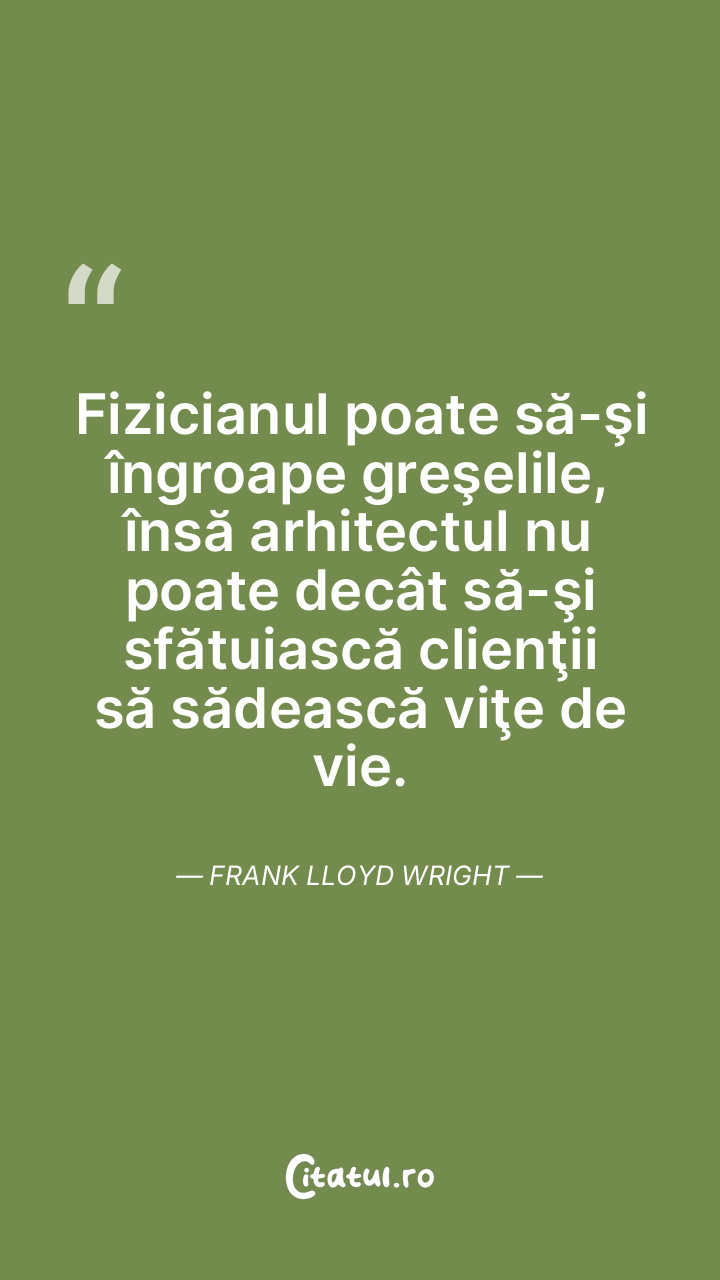 Un doctor îşi poate îngropa greşelile, însă un arhitect nu poate decât să-şi sfătuiască clienţii să planteze viţă de vie. Frank Lloyd Wright