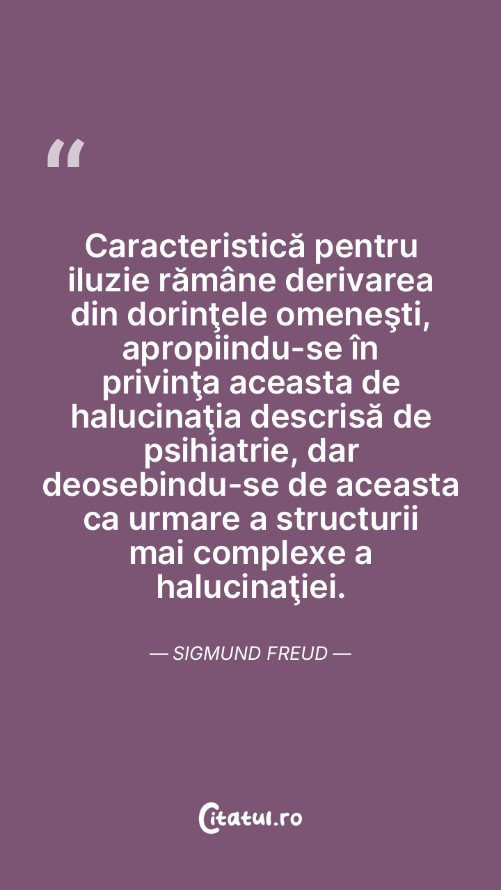 În cazul halucinaţiei reliefăm ca element esenţial conflictul cu realitatea, pe când iluzia nu trebuie să fie necesarmente falsă, adică irealizabilă sau în opoziţie cu realitatea. Sigmund Freud
