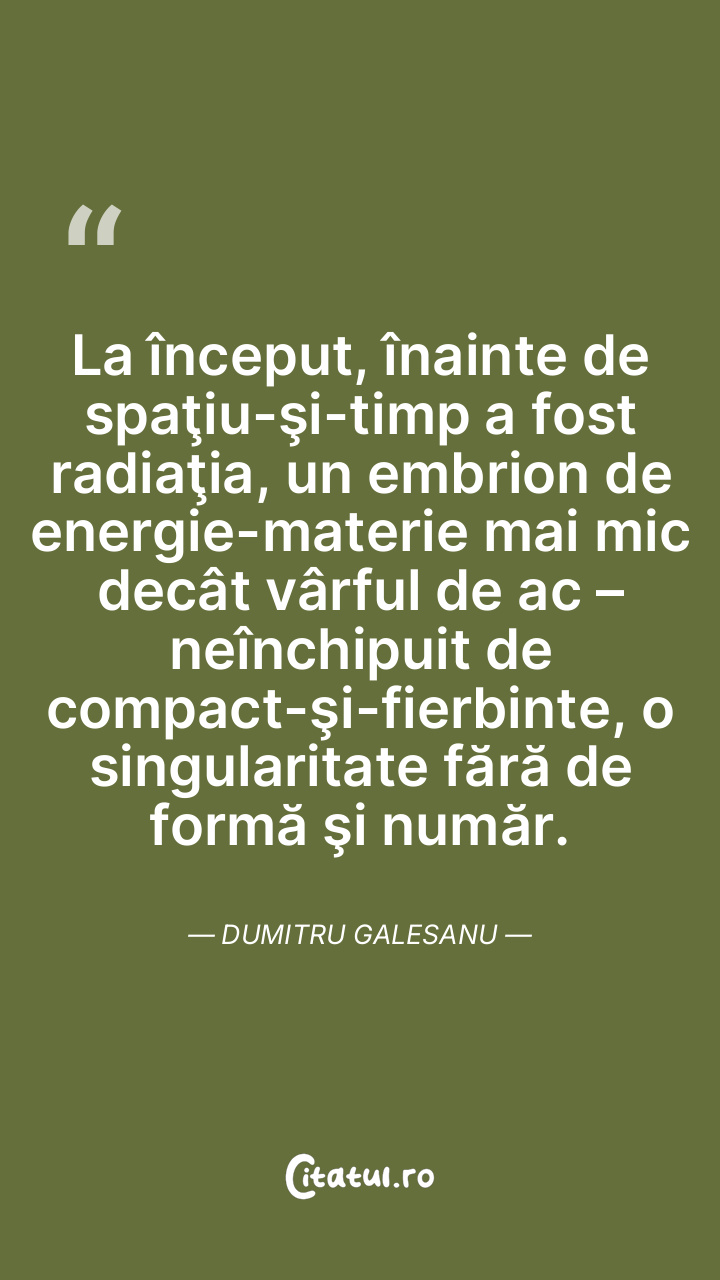 La început, în genunea începutului neînceput, universul astăzi ştiut era cât o sămânţă, un proton în afară de spaţiu-timp, unică fiinţă şi nimb. Dumitru Galesanu