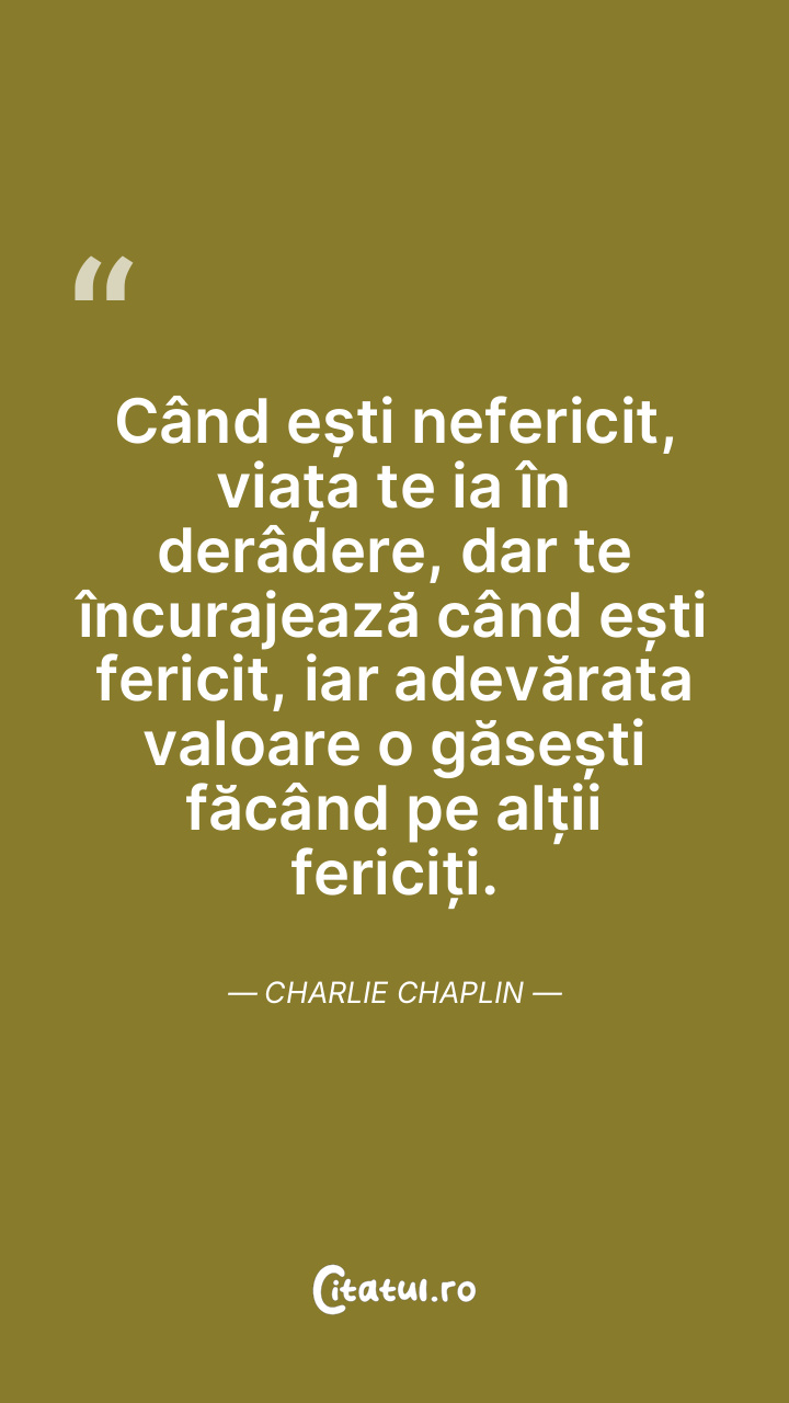 Când ești nefericit, viața te ia în derâdere, dar te încurajează când ești fericit, iar adevărata valoare o găsești făcând pe alții fericiți. Charlie Chaplin