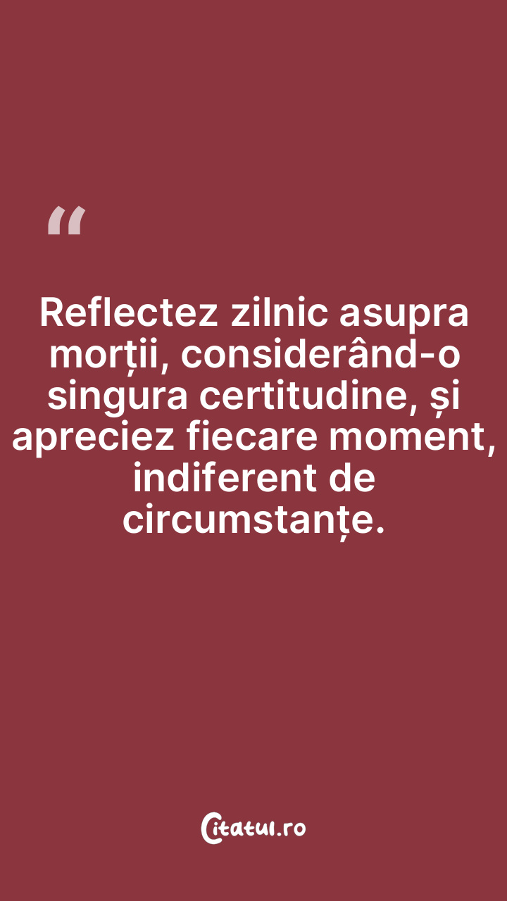 Reflectez zilnic asupra morții, considerând-o singura certitudine, și apreciez fiecare moment, indiferent de circumstanțe.