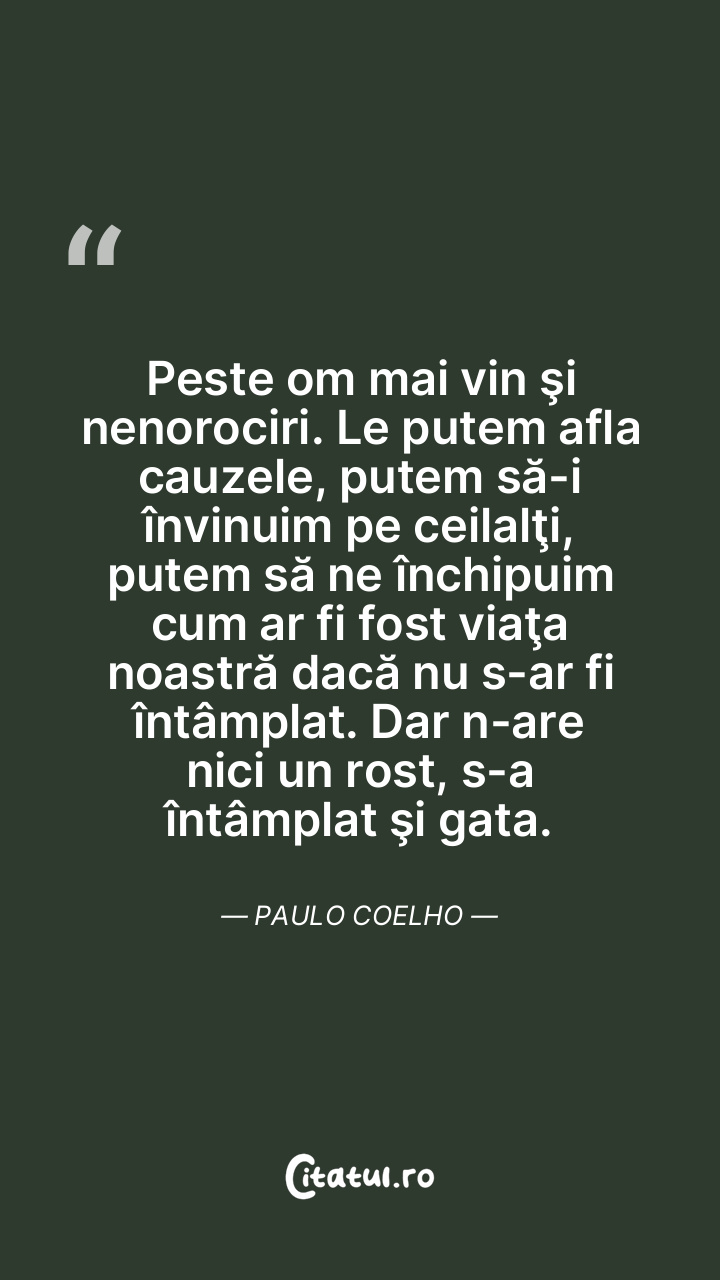 Peste om mai vin şi nenorociri. Le putem afla cauzele, putem să-i învinuim pe ceilalţi, putem să ne închipuim cum ar fi fost viaţa noastră dacă nu s-ar fi întâmplat. Dar n-are nici un rost, s-a întâmplat şi gata. Paulo Coelho