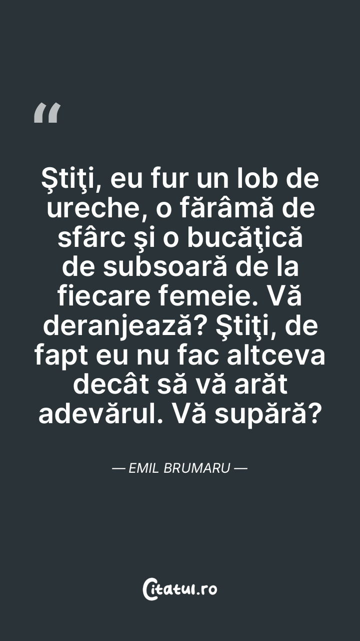 Ştiţi, eu fur un lob de ureche, o fărâmă de s ... Citește tot citatul >