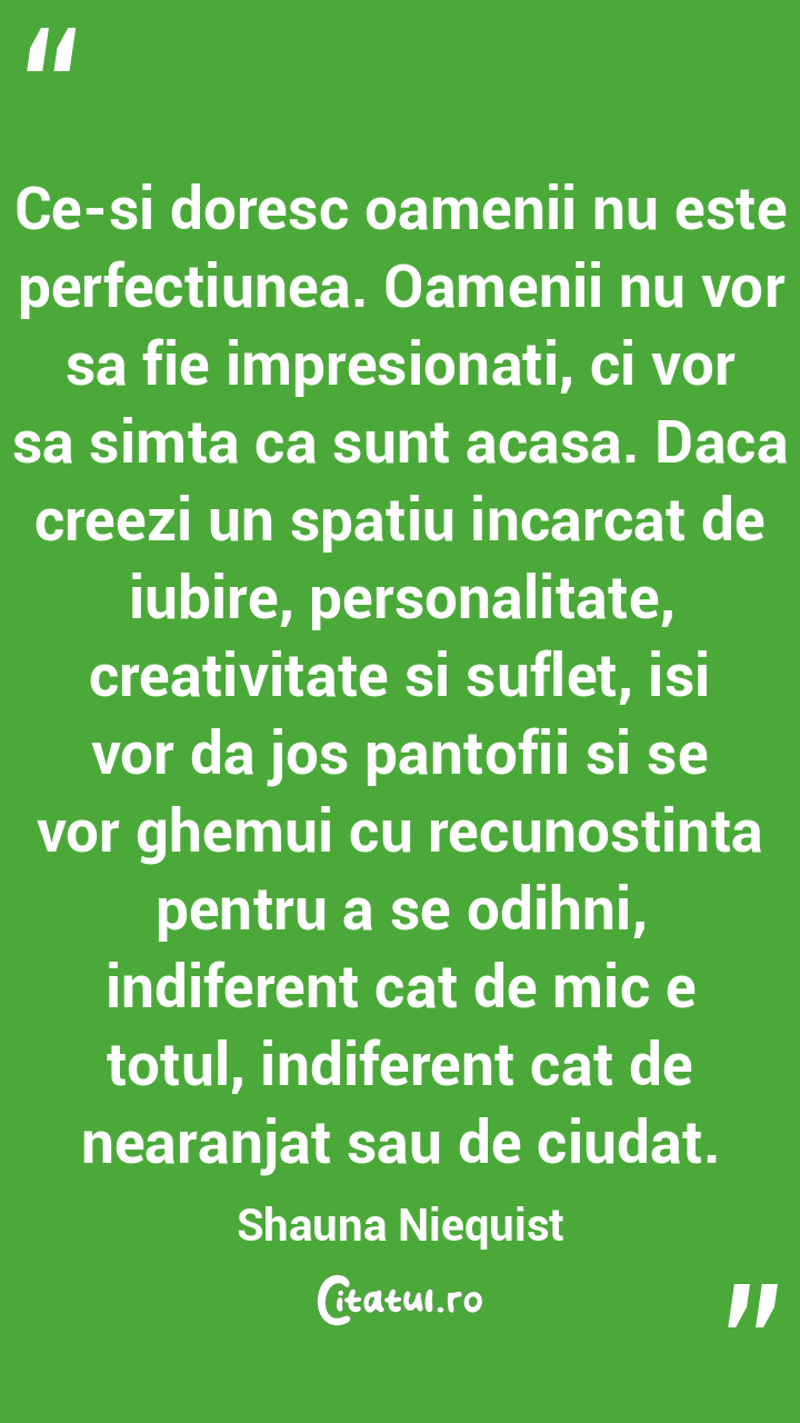 Ce-si doresc oamenii nu este perfectiunea. Oamenii nu vor sa fie impresionati, ci vor sa simta ca sunt acasa. Daca creezi un spatiu incarcat de iubire, personalitate, creativitate si suflet, isi vor da jos pantofii si se vor ghemui cu recunostinta pentru a se odihni, indiferent cat de mic e totul, indiferent cat de nearanjat sau de ciudat. Shauna Niequist
